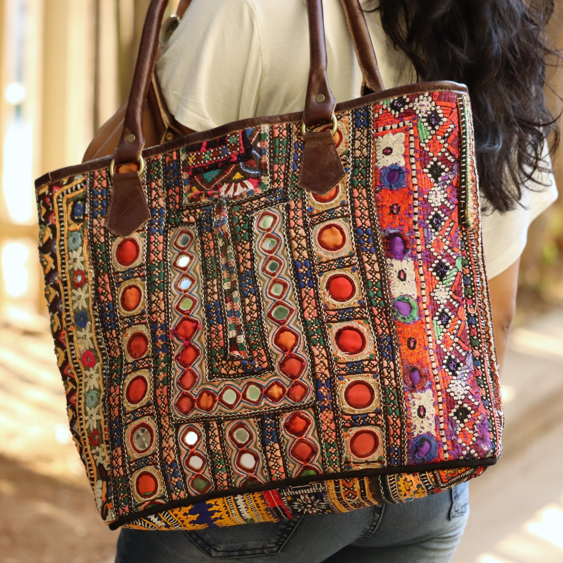 Stay organized with our Gypsy tote at Bombay Blossom. This Bag is made from hand embroidered Kutchi tribal fabric which has multicolored patchwork all over including the base of the bag.