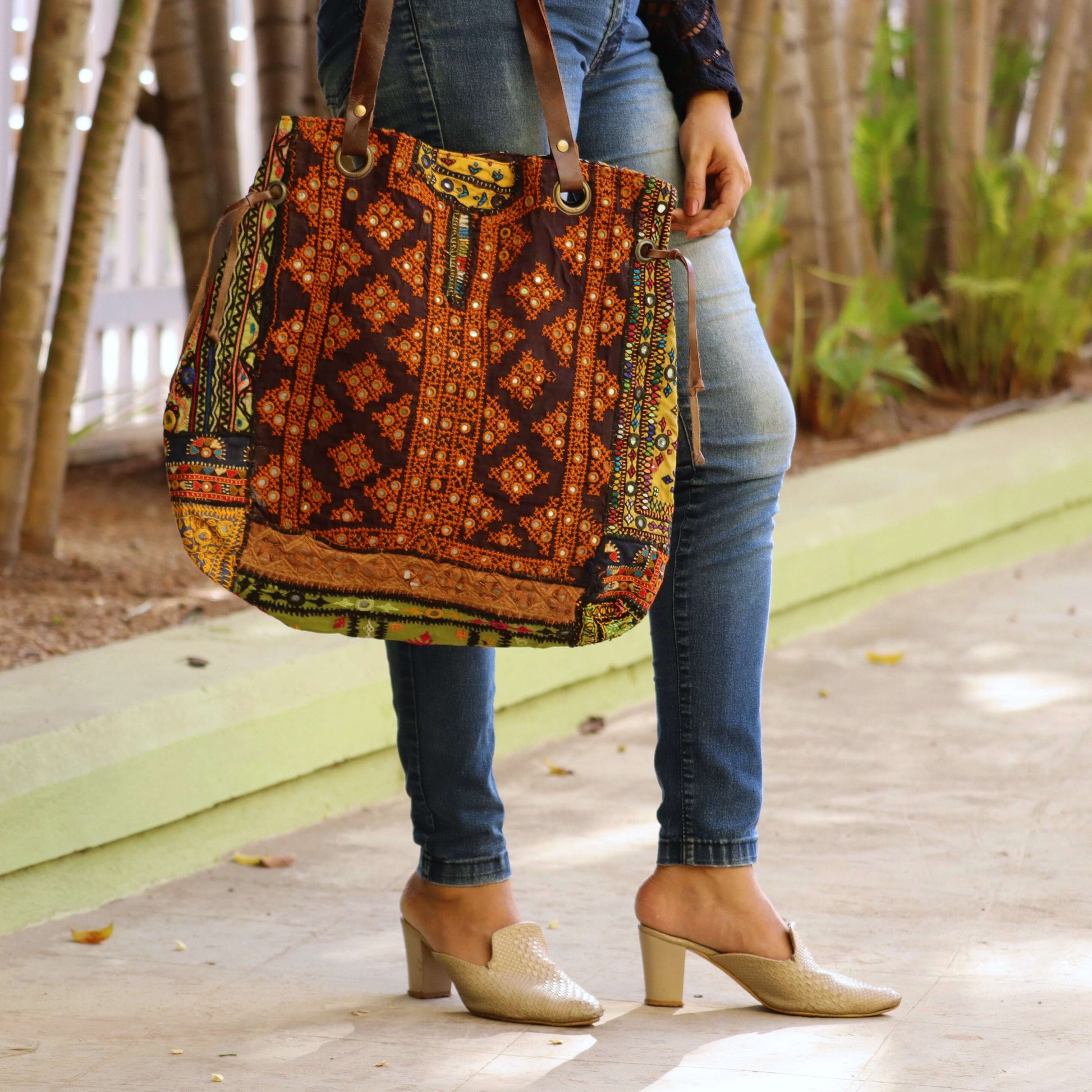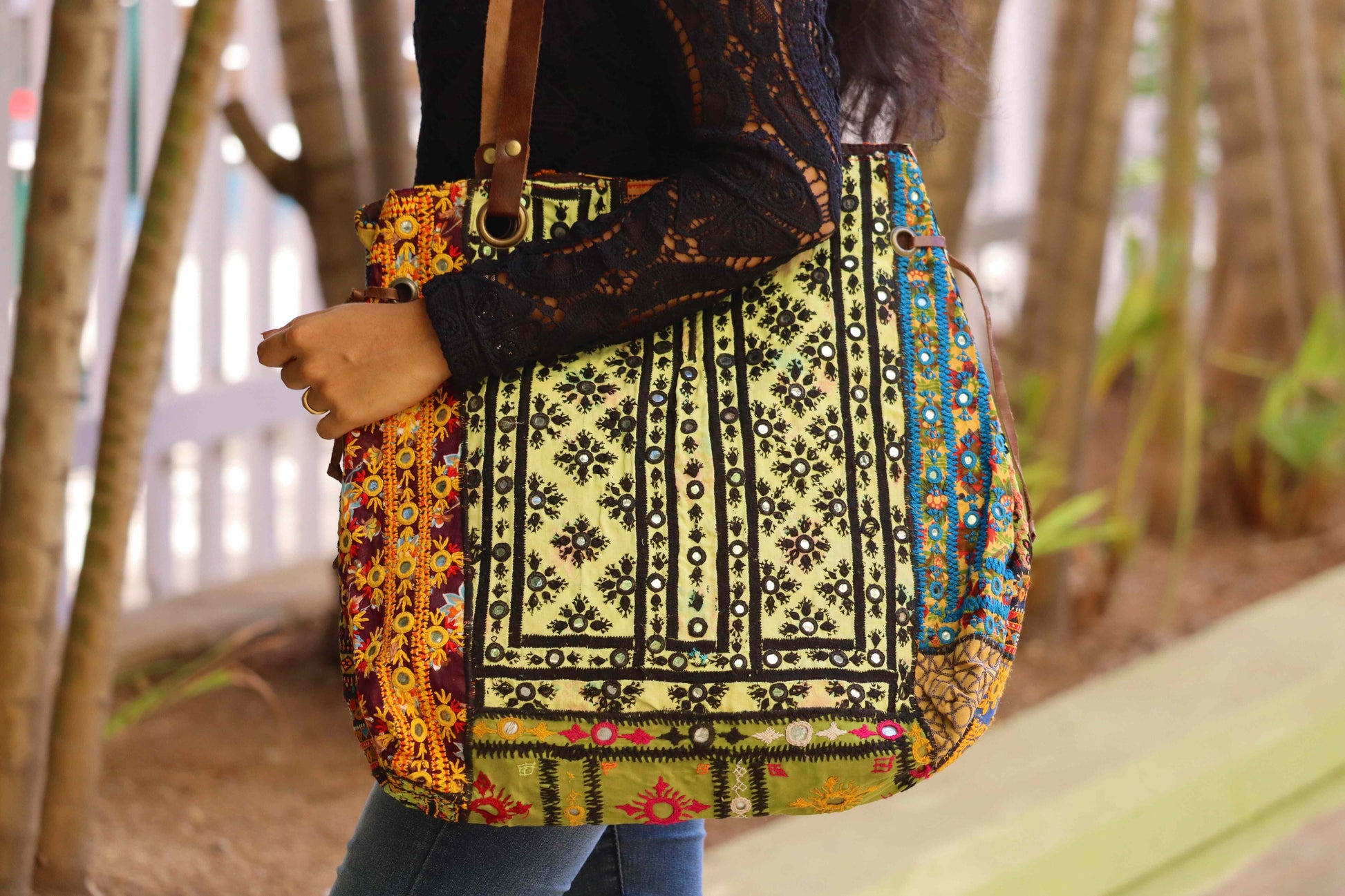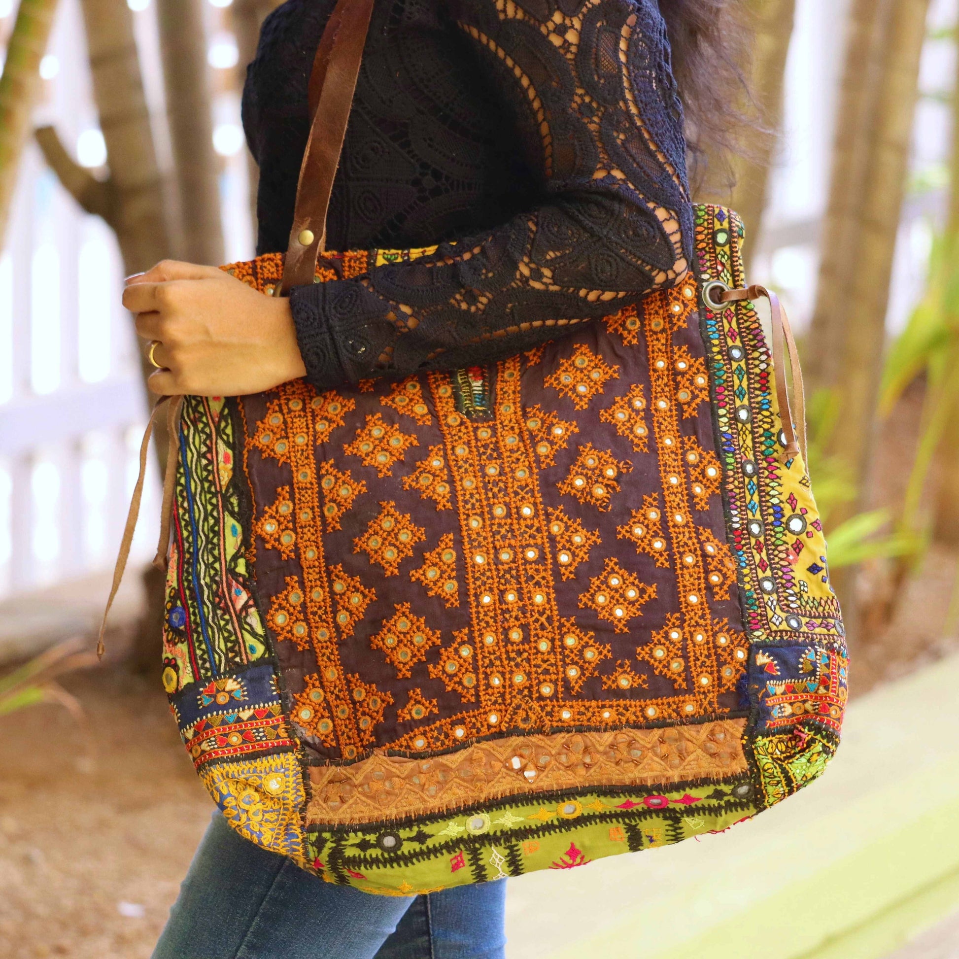 Stay organized with our Gypsy tote at Bombay Blossom. This Bag is made from hand embroidered Kutchi tribal fabric which has multicolored patchwork all over including the base of the bag.