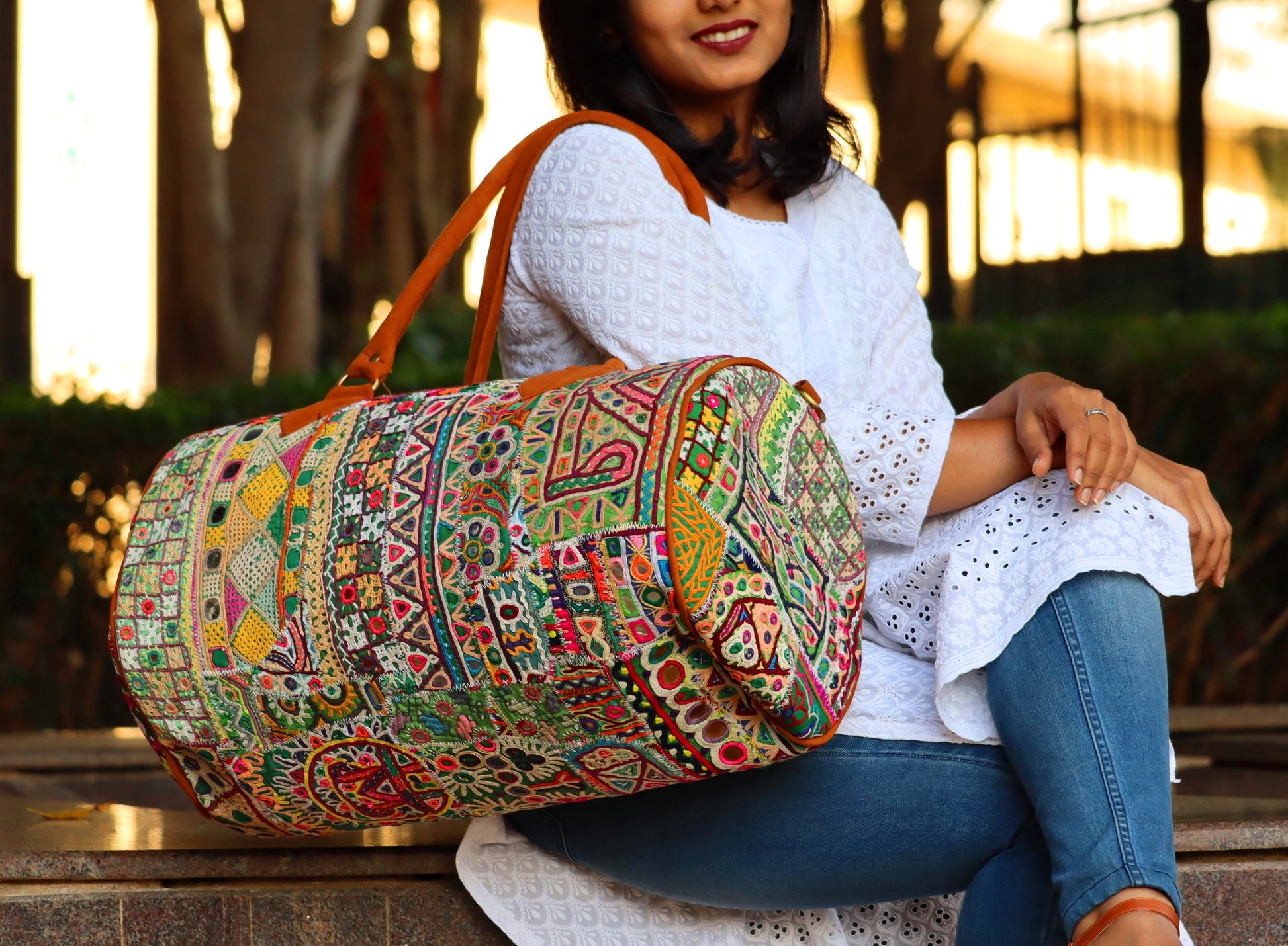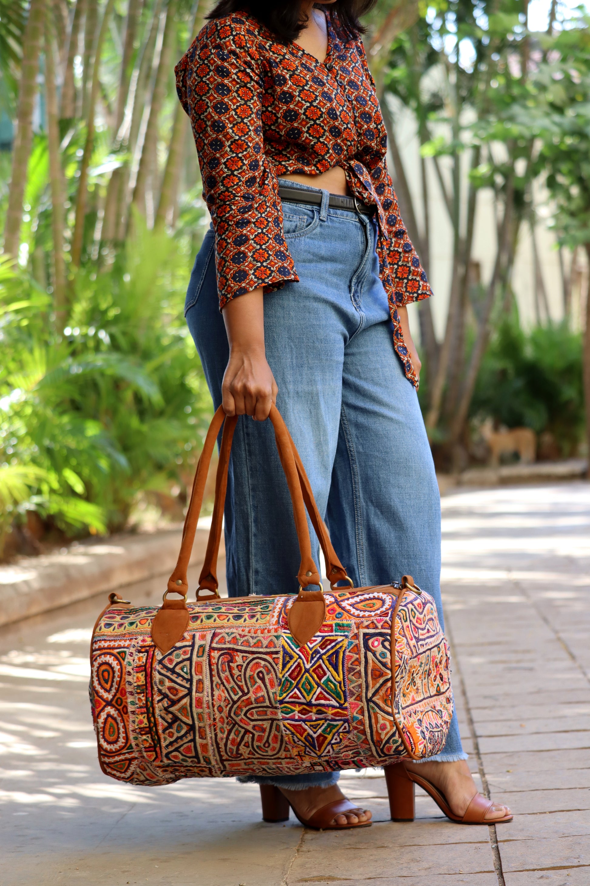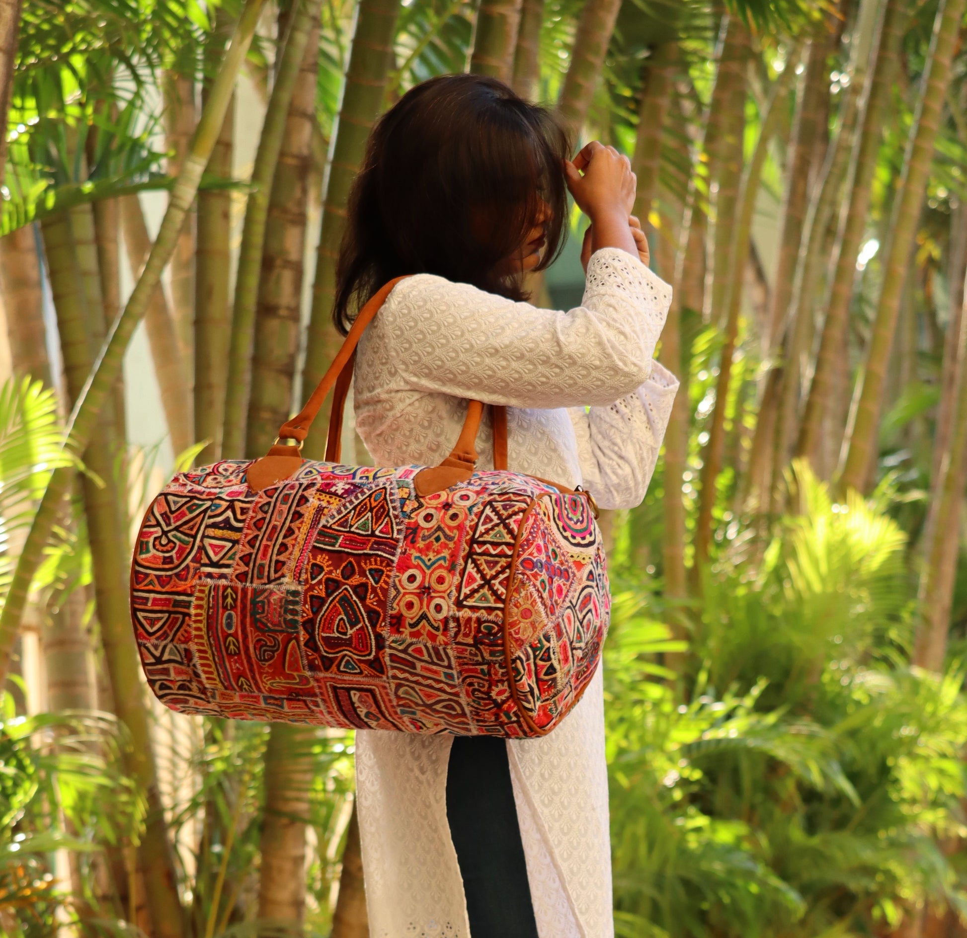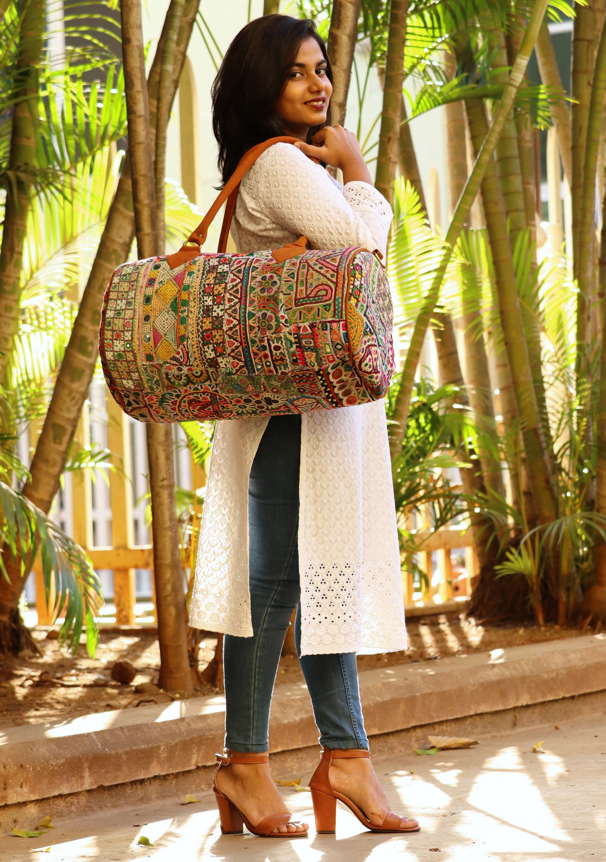 Stay classy with our handcrafted large duffel bag at Bombay Blossom.
