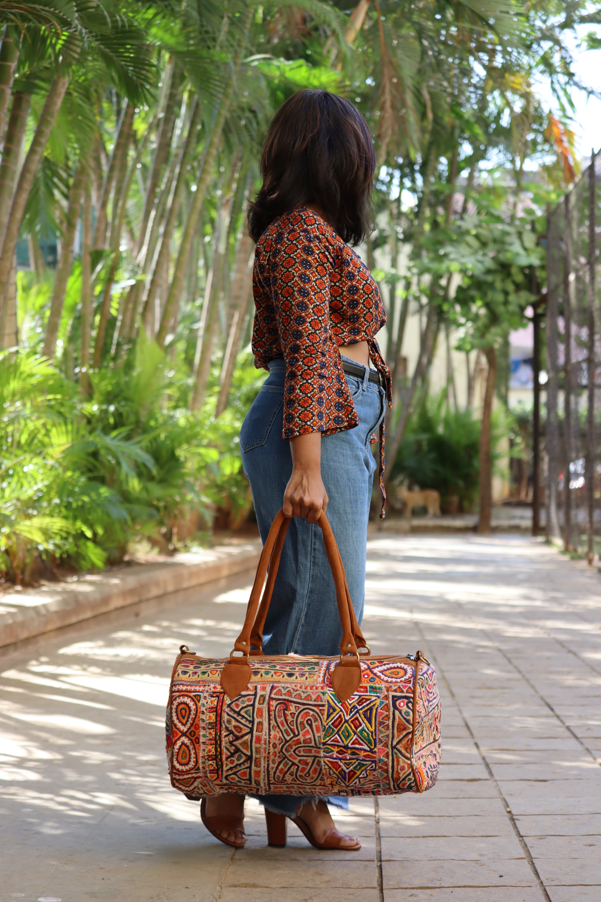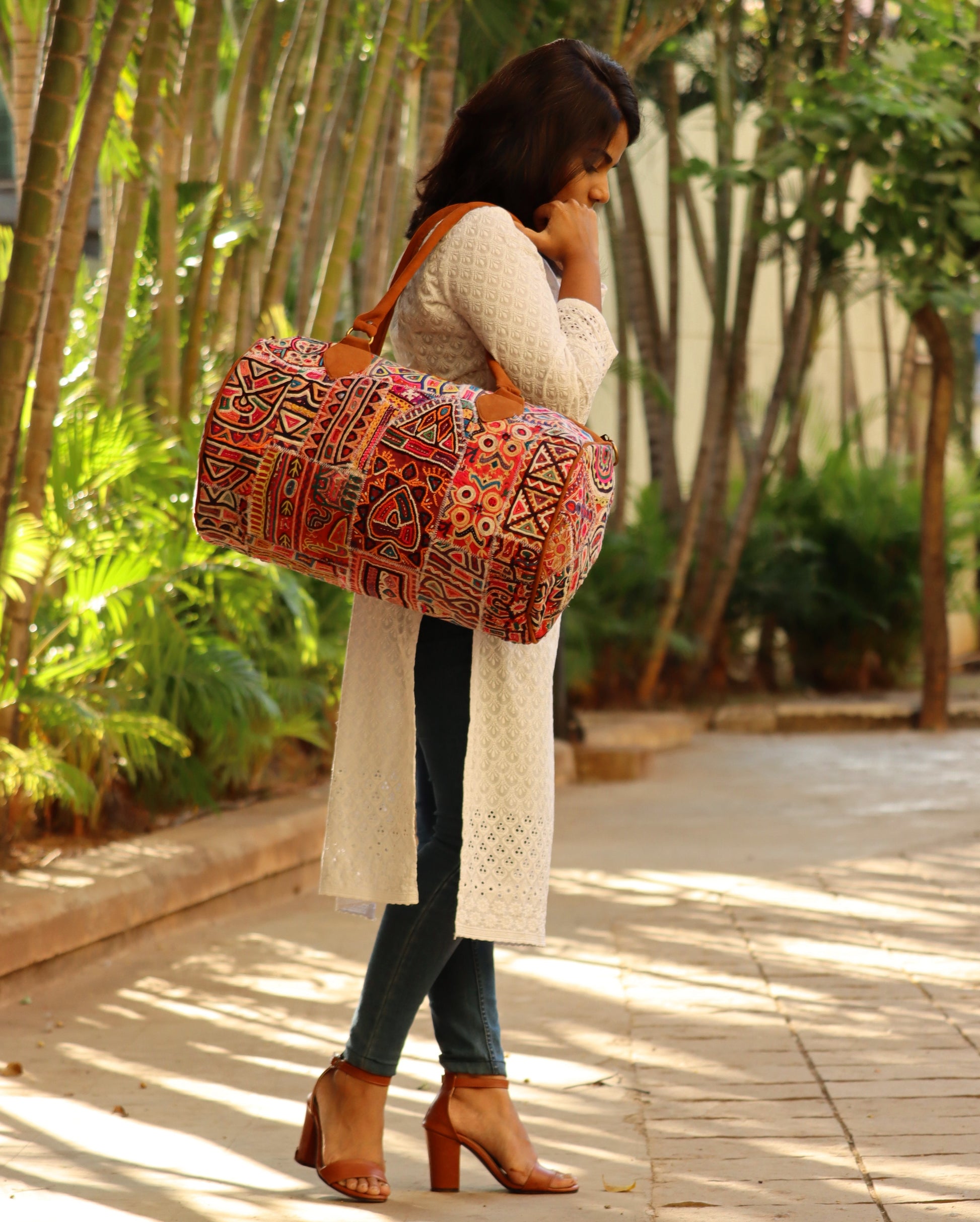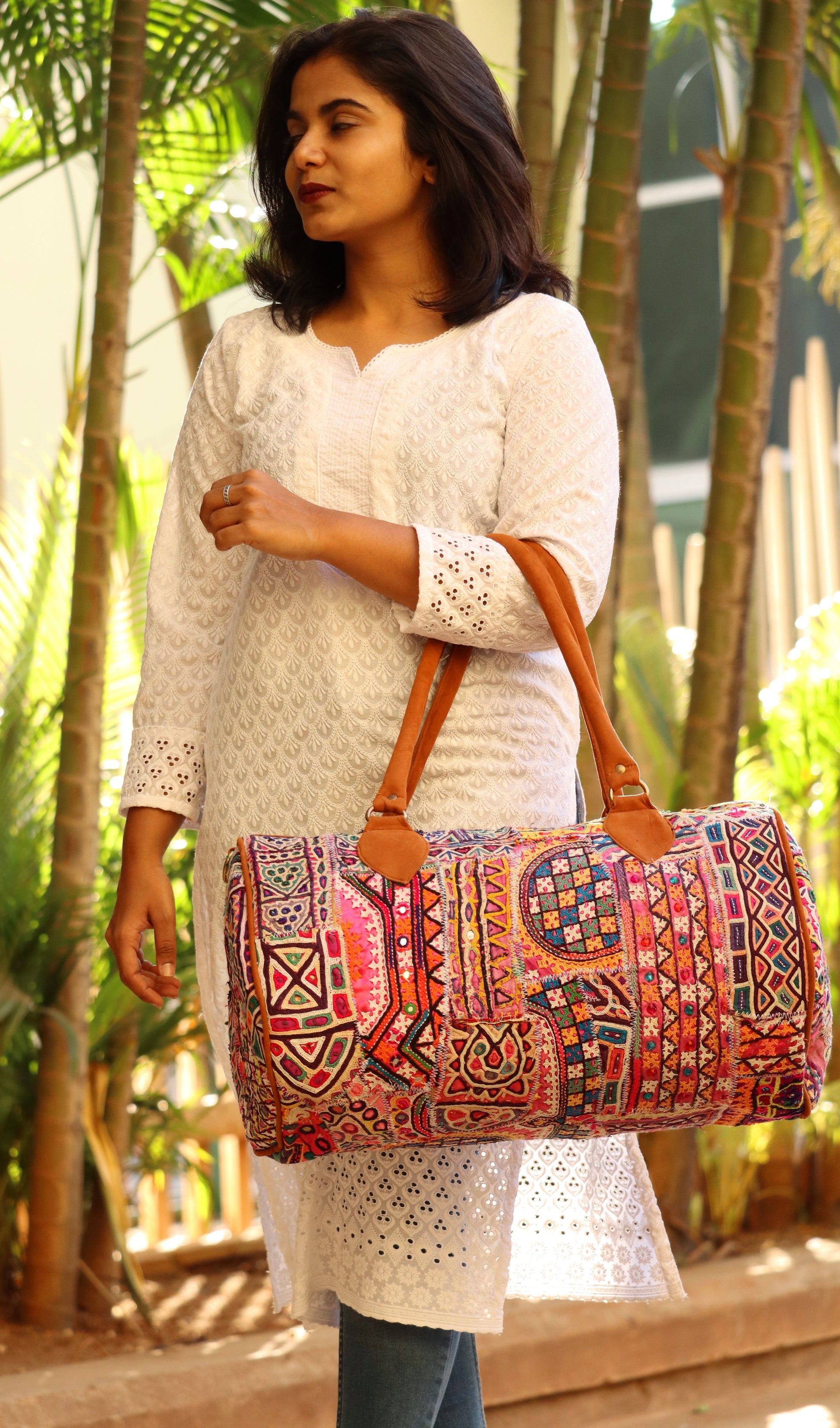 Stay classy with our handcrafted large duffel bag at Bombay Blossom.